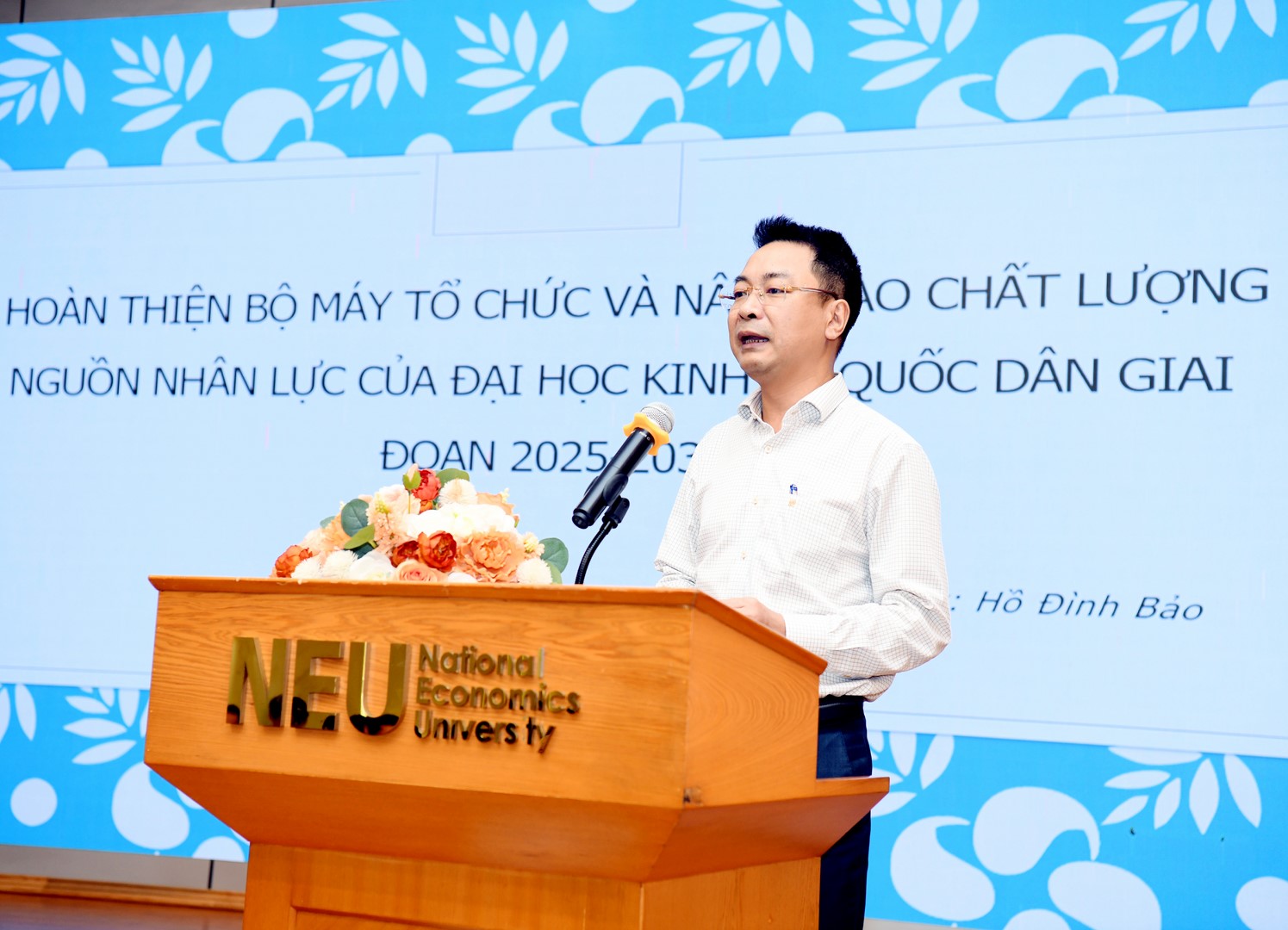 PGS.TS Hồ Đình Bảo – Trưởng phòng Tổ chức Cán bộ trình bày tham luận “Hoàn thiện bộ máy tổ chức và nâng cao chất lượng nguồn nhân lực của Đại học Kinh tế Quốc dân giai đoạn 2025-2030”
