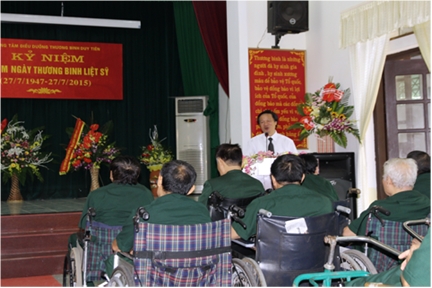 Ông Nguyễn Sỹ Lương, Giám đốc Trung tâm Điều dưỡng Thương binh Duy Tiên cho biết, hiện nay Trung tâm đang chăm sóc, điều trị cho 60 thương binh, bệnh binh nặng của 18 tỉnh, thành phố trong cả nước, trong đó thương binh cao tuổi nhất là 85 tuổi, ít tuổi nhất là 47 tuổi. Những năm qua, được sự quan tâm của Đảng, Nhà nước, các cấp, các ngành, sự chăm sóc tận tình của các cán bộ, nhân viên Trung tâm, đời sống vật chất và tinh thần của các thương, bệnh binh ở Trung tâm luôn được bảo đảm.